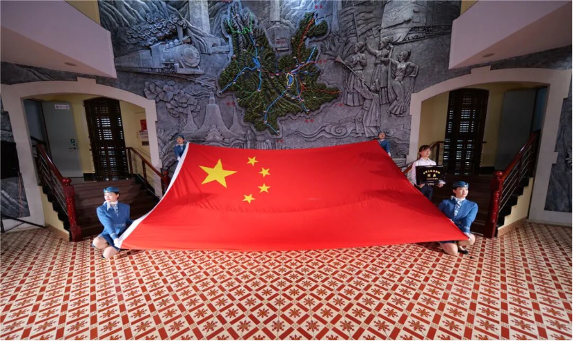 10月1日,中老铁路开通当日天安门升旗国旗亮相云南铁路博物馆。这面国旗于2021年12月3日,中老两国元首宣布中老铁路全线开通运营当日,在天安门广场升起。