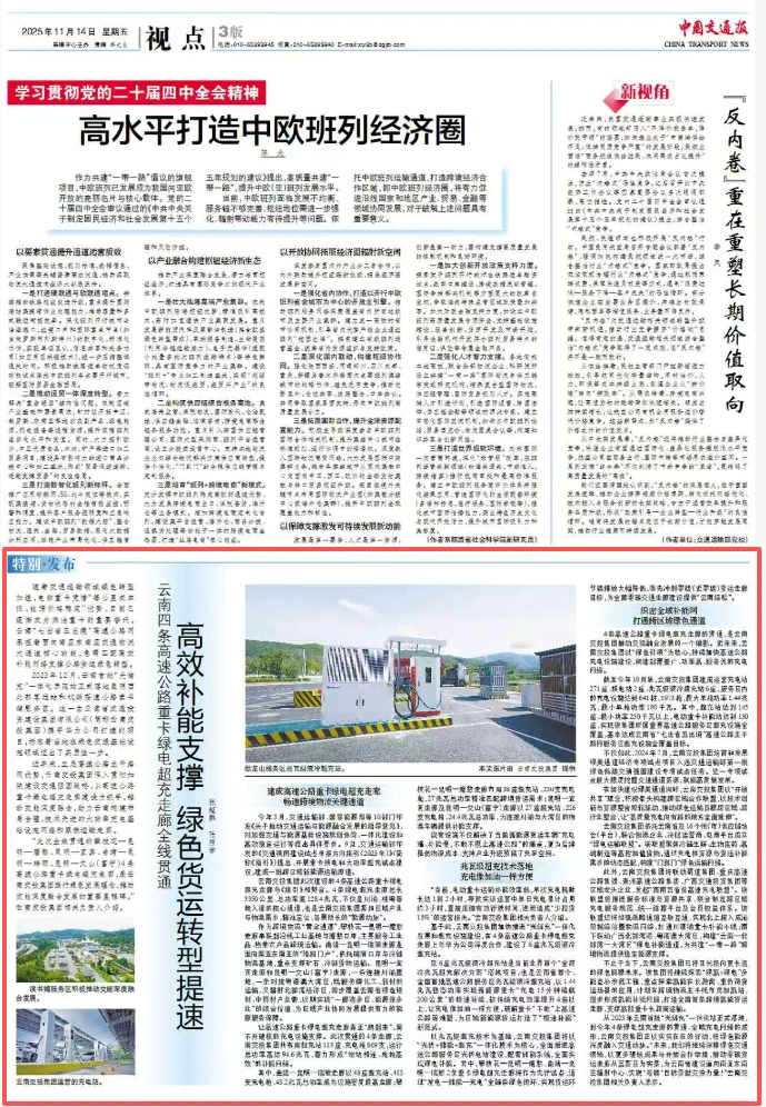 从2023年云南首批“光储充”一体化站正式落地,到今年4条绿电超充走廊的贯通、全域充电网络的成形,云南交投集团正以实实在在的行动,将绿色能源深度融入交通动脉。“未来,我们将继续深耕绿色交通领域,以更多硬核成果与开放合作举措,推动零碳货运走廊从蓝图变为实景,为云南省建设面向南亚东南亚辐射中心、实现‘双碳’目标贡献交投力量!”云南交投集团相关负责人表示。