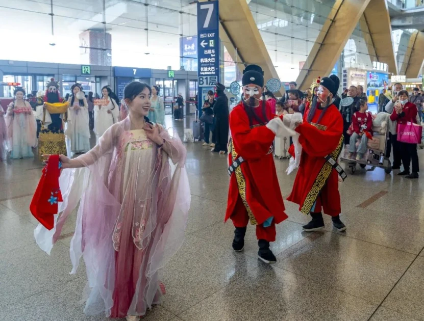 大年初一至初三,昆明长水国际机场推出“空港春韵·翱翔迎新”专场活动,航站楼变身文旅大舞台,财神巡游、四丑闹春、民族打跳等节目轮番上演,“财神”派发元宝巧克力、“花神”赠送鲜花,为旅客送上新春祝福。活动还走进市内主要景区,邀请游客“来昆明过大年”。