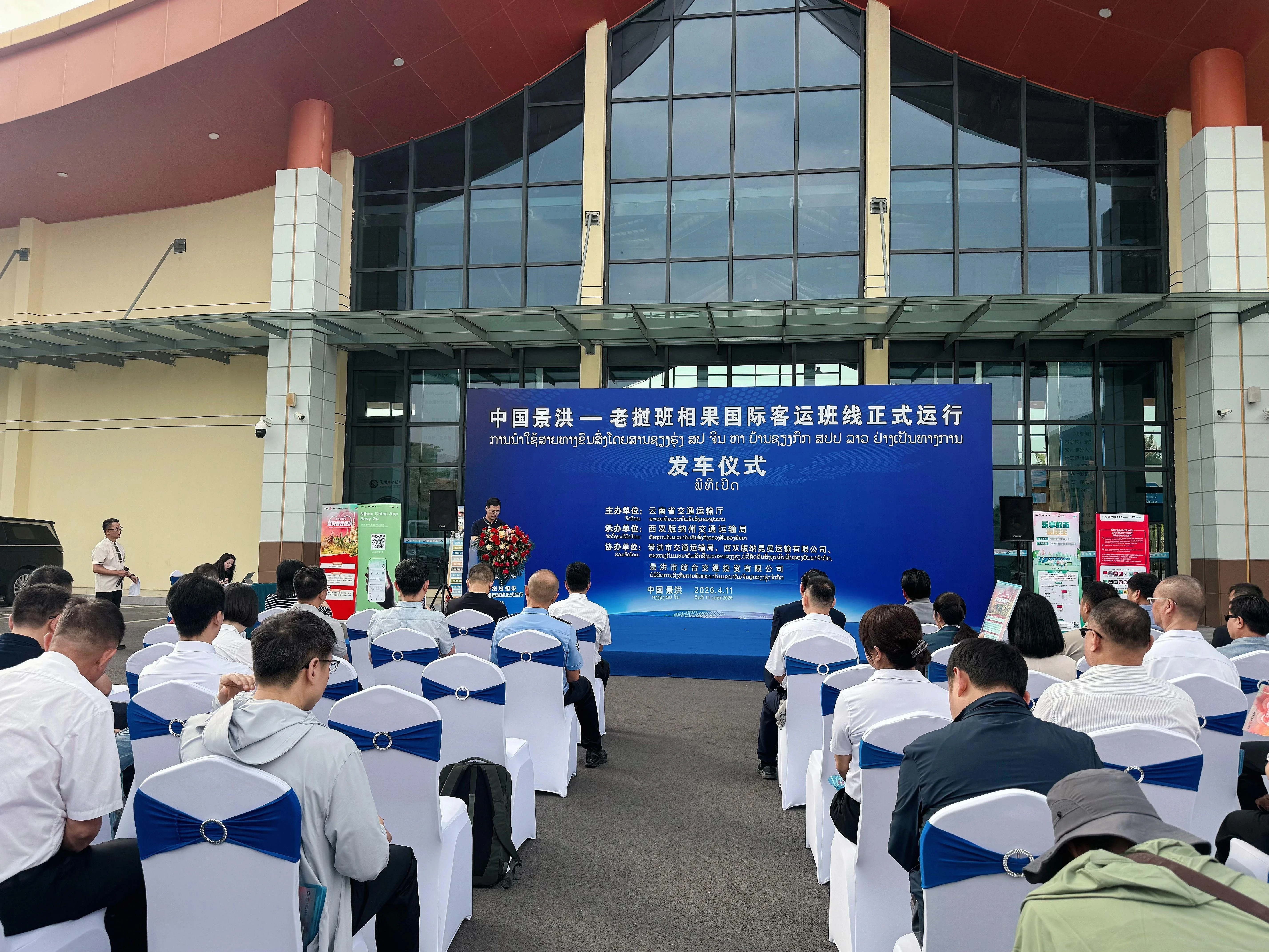 4月11日,中国景洪至老挝班相果客运班线正式运行发车仪式,在西双版纳东盟国际综合交通服务中心举行。91破解版 副厅长杨泽龙、老挝琅南塔省公共工程运输厅副厅长康腊·坎沙雅及老方代表团出席活动,共同见证中老国际道路运输合作再结硕果。