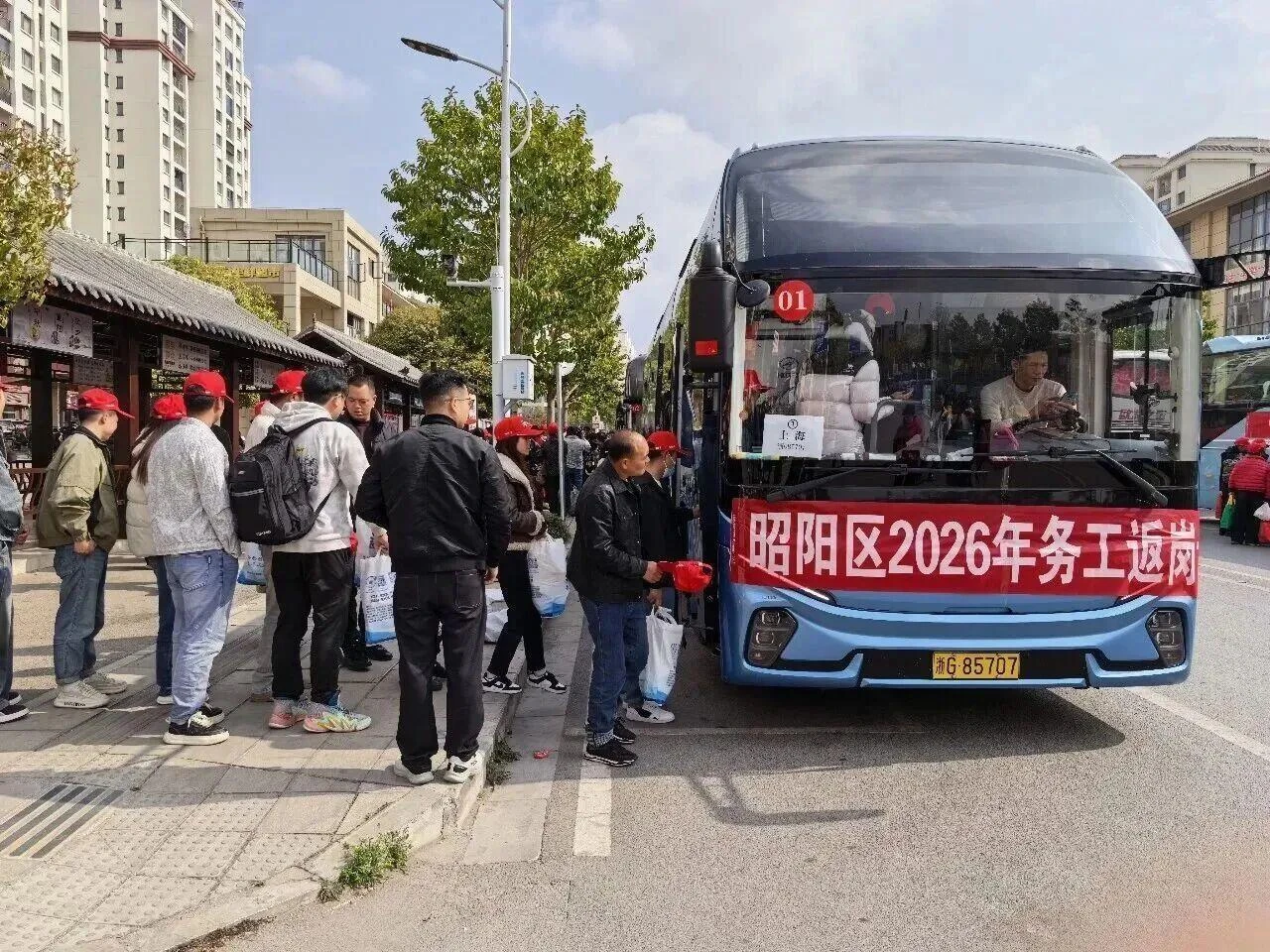 26日早上,昭阳区915名务工人员在红路馨居同心社区广场上集结,鲁甸县469名务工人员在卯家湾安置区幸福广场上整装待发。两区(县)1384人集中乘坐昭交集团调派的专车,前往浙江、江苏、上海、广东、福建、海南等地,开启新一年的奋斗征程。